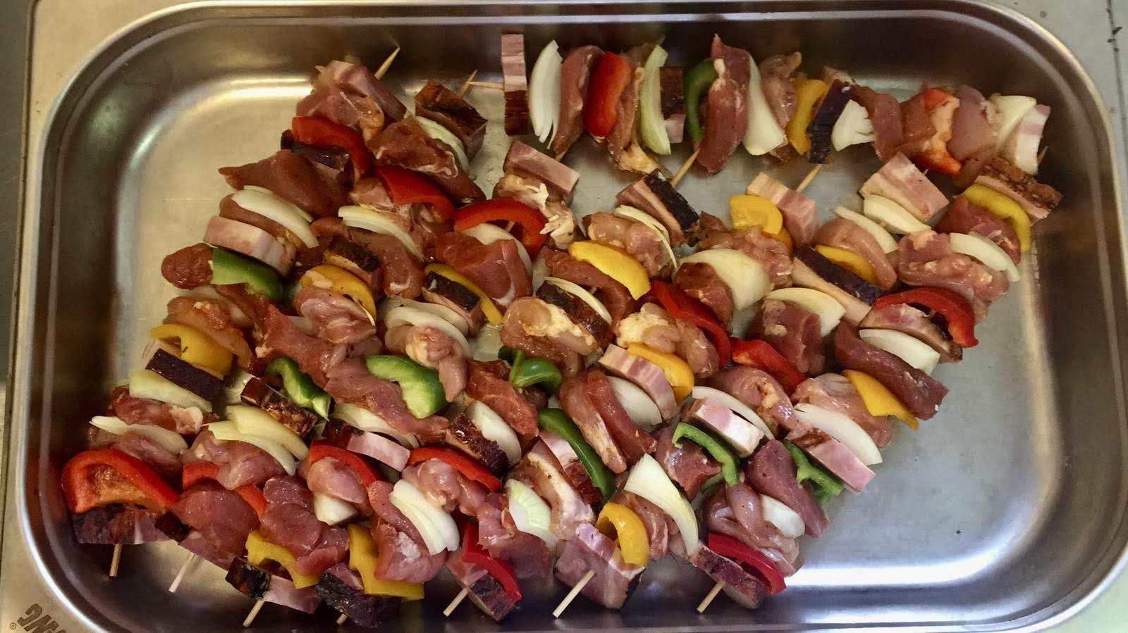 Vepřové, kuřecí maso, slanina, cibule, paprika