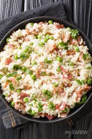 Italské krémové rizoto, kuřecí maso, slanina, cibulka, smetana, parmezán, hrášek